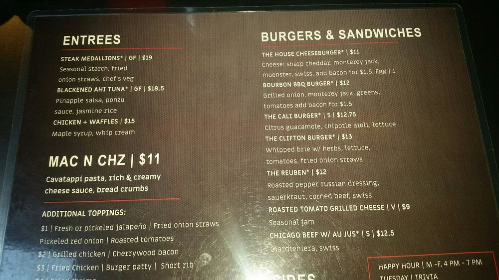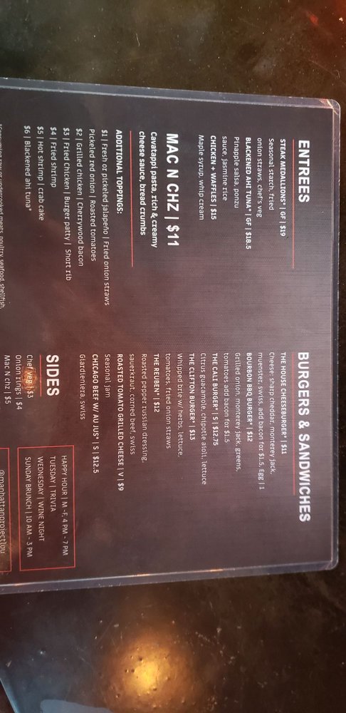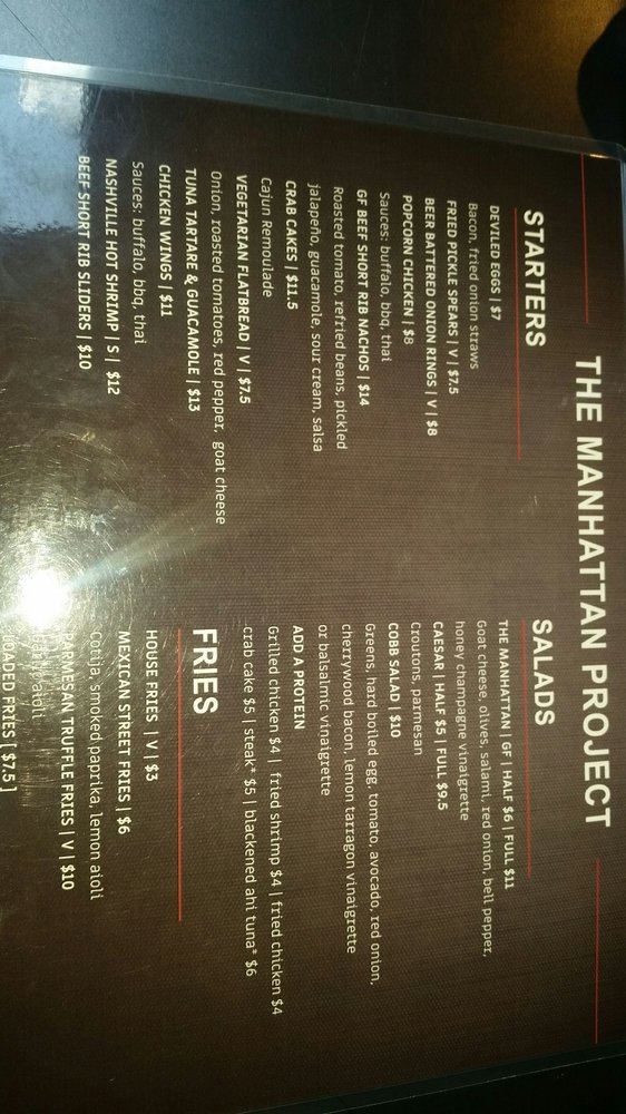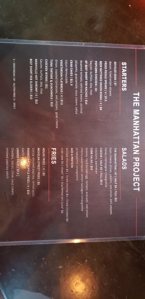 Introducing The Manhattan Project located at 2101 Frankfort Ave in Louisville, KY, is a trendy sports bar that offers a variety of American cuisine, focusing on delicious burgers and appetizers. The menu showcases mouth-watering starters like Jalapeno Artichoke Dip Bacon and Shrimp Cocktail. Their signature dish, the Manhattan Salad, is a must-try with its unique blend of flavors. Burgers like the House Cheeseburger and the Pimento Smash Burger are standout options for burger enthusiasts. Customers rave about the friendly service and the vibrant atmosphere, making it a great spot for gatherings or watching sports games. With a wide range of amenities like outdoor seating, full bar, and happy hour specials, The Manhattan Project is a top choice for a fun and satisfying dining experience.